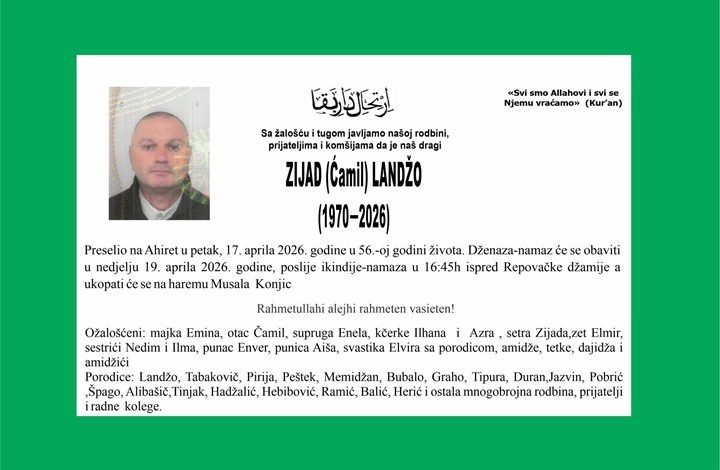 Početna/Smrtovnice/Zijad (Ćamil) Landžo 1970 – 2026 SmrtovniceVijesti Zijad (Ćamil) Landžo 1970 – 2026 nk 1 Send an email 3 dana ago 2.454 Manje od minute Podijeli Facebook Twitter LinkedIn Zijad Landžo preselio na Ahiret u 56. godini života. nk 1 Send an email 3 dana ago 2.454 Manje od minute Podijeli Facebook Twitter LinkedIn Podijeli Facebook Twitter LinkedIn Share via Email Print