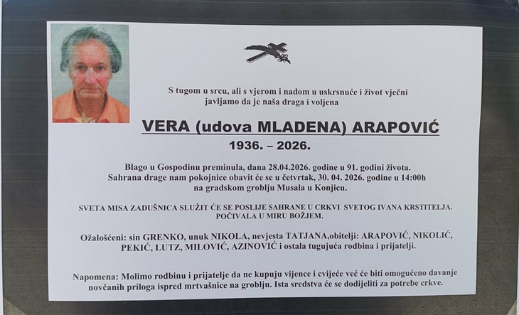 Vera Arapović preminula u 91. godini života.